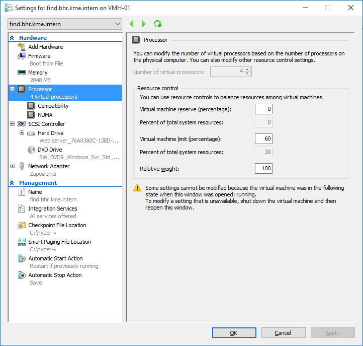 The third textbox is the weight. This is relative. Every VM set to 100 (the default) has the same pull with the scheduler, but they’re all beneath all the VMs that have 200, and above the VMs that have 50. If you’re going to tinker, this is safer than messing with reserves because you can’t ever prevent a VM from starting by changing relative weights. Weight means is that when a bunch of VMs present threads to the hypervisor thread scheduler at once, the higher weighted VMs go first. That’s all.