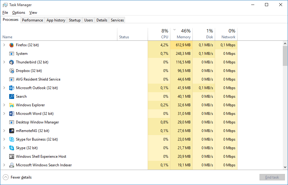 Task Manager then looked pretty much like Task Manager now. You had a long list of running processes, all of them with a metric indicating what percentage of the CPUs time they were using. Each line item you see is a process (in the recent Task Manager versions, a process group).